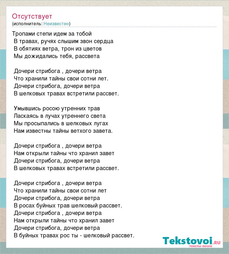 Тропами степи идем за тобой В травах, ручях слышим звон сердца В обятиях ветра, трон из цветов Мы дожидались тебя, рассвета Дочери стрибога , дочери ветра Что хранили тайны свои сотни лет. Дочери стрибога, дочери ветра В шелковых травах встретили рассвет. Умывшись росою утренних трав Ласкаясь в лучах утреннего света Мы просыпались в шелковых лугах Нам известны тайны ветхого завета. Дочери стрибога , дочери ветра Нам открыли тайны что хранил завет Дочери стрибога, дочери ветра В шелковых травах встретили рассвет. Дочери стрибога , дочери ветра Что хранили тайны свои сотни лет Дочери стрибога, дочери ветра В росах буйных трав шелковый рассвет. Дочери стрибога , дочери ветра Нам открыли тайны что хранил завет Дочери стрибога, дочери ветра В буйных травах рос ты - шелковый рассвет.