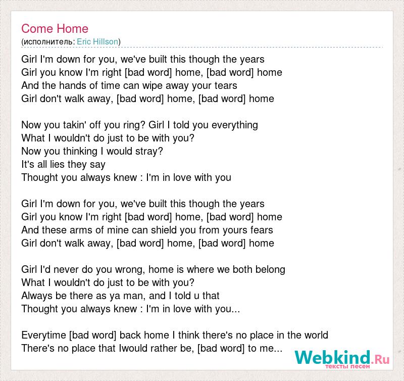 Girl I'm down for you, we've built this though the years Girl you know I'm right [bad word] home, [bad word] home And the hands of time can wipe away your tears Girl don't walk away, [bad word] home, [bad word] home Now you takin' off you ring? Girl I told you everything What I wouldn't do just to be with you? Now you thinking I would stray? It's all lies they say Thought you always knew : I'm in love with you Girl I'm down for you, we've built this though the years Girl you know I'm right [bad word] home, [bad word] home And these arms of mine can shield you from yours fears Girl don't walk away, [bad word] home, [bad word] home Girl I'd never do you wrong, home is where we both belong What I wouldn't do just to be with you? Always be there as ya man, and I told u that Thought you always knew : I'm in love with you... Everytime [bad word] back home I think there's no place in the world There's no place that Iwould rather be, [bad word] to me...