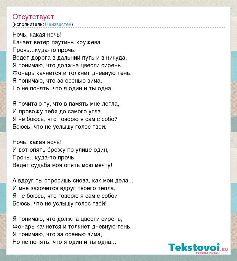 Ночь, какая ночь! Качает ветер паутины кружева. Прочь...куда-то прочь. Ведет дорога в дальний путь и в никуда. Я понимаю, что должна цвести сирень. Фонарь качнется и толкнет дневную тень. Я понимаю, что за осенью зима, Но не понять, что я один и ты одна. Я почитаю ту, что в память мне легла, И провожу тебя до самого угла. Я не боюсь, что говорю я сам с собой Боюсь, что не услышу голос твой. Ночь, какая ночь! И вот опять брожу по улице один, Прочь...куда-то прочь. Ведёт судьба моя опять мою мечту! А вдруг ты спросишь снова, как мои дела... И мне захочется вдруг твоего тепла, Я не боюсь, что говорю я сам с собой Боюсь, что не услышу голос твой! Я понимаю, что должна цвести сирень, Фонарь качнется и толкнет дневную тень. Я понимаю, что за осенью зима, Но не понять, что я один и ты одна...