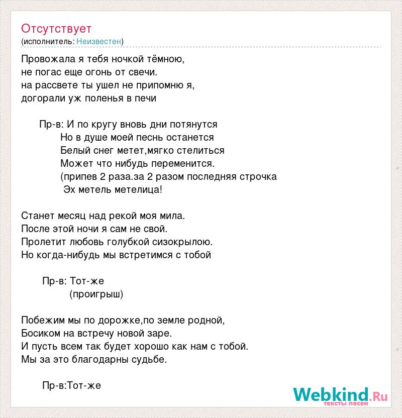 Провожала я тебя ночкой тёмною, не погас еще огонь от свечи. на рассвете ты ушел не припомню я, догорали уж поленья в печи Пр-в: И по кругу вновь дни потянутся Но в душе моей песнь останется Белый снег метет,мягко стелиться Может что нибудь переменится. (припев 2 раза.за 2 разом последняя строчка Эх метель метелица! Станет месяц над рекой моя мила. После этой ночи я сам не свой. Пролетит любовь голубкой сизокрылою. Но когда-нибудь мы встретимся с тобой Пр-в: Тот-же (проигрыш) Побежим мы по дорожке,по земле родной, Босиком на встречу новой заре. И пусть всем так будет хорошо как нам с тобой. Мы за это благодарны судьбе. Пр-в:Тот-же