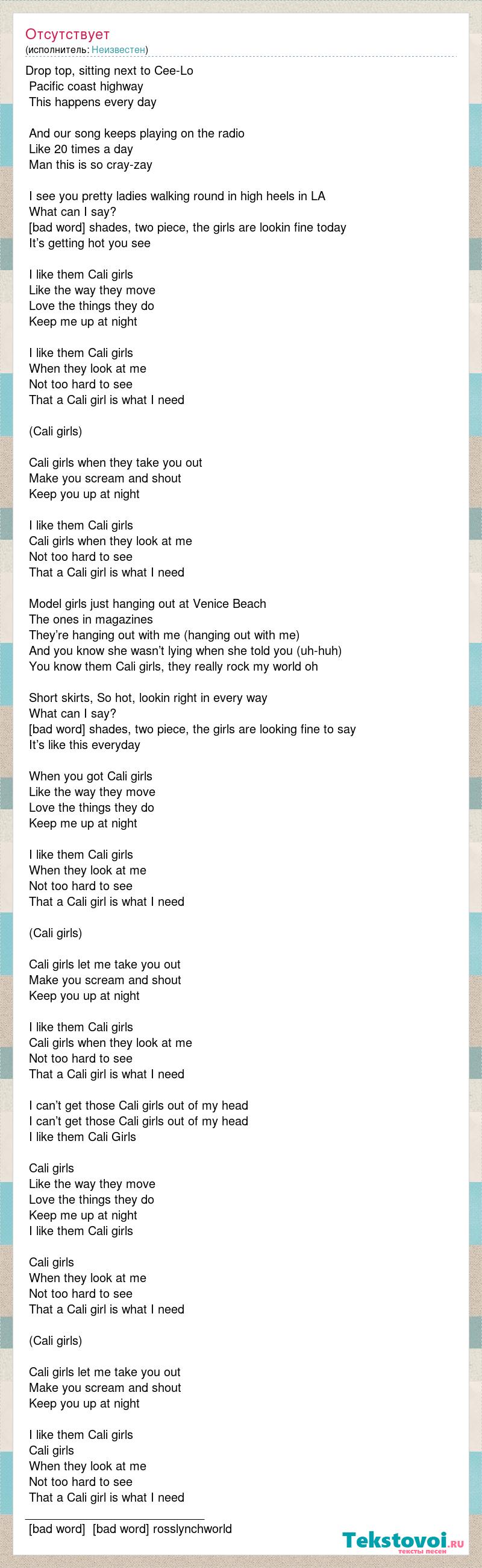 Drop top, sitting next to Cee-Lo Pacific coast highway This happens every day And our song keeps playing on the radio Like 20 times a day Man this is so cray-zay I see you pretty ladies walking round in high heels in LA What can I say? [bad word] shades, two piece, the girls are lookin fine today It’s getting hot you see I like them Cali girls Like the way they move Love the things they do Keep me up at night I like them Cali girls When they look at me Not too hard to see That a Cali girl is what I need (Cali girls) Cali girls when they take you out Make you scream and shout Keep you up at night I like them Cali girls Cali girls when they look at me Not too hard to see That a Cali girl is what I need Model girls just hanging out at Venice Beach The ones in magazines They’re hanging out with me (hanging out with me) And you know she wasn’t lying when she told you (uh-huh) You know them Cali girls, they really rock my world oh Short skirts, So hot, lookin right in every way What can I say? [bad word] shades, two piece, the girls are looking fine to say It’s like this everyday When you got Cali girls Like the way they move Love the things they do Keep me up at night I like them Cali girls When they look at me Not too hard to see That a Cali girl is what I need (Cali girls) Cali girls let me take you out Make you scream and shout Keep you up at night I like them Cali girls Cali girls when they look at me Not too hard to see That a Cali girl is what I need I can’t get those Cali girls out of my head I can’t get those Cali girls out of my head I like them Cali Girls Cali girls Like the way they move Love the things they do Keep me up at night I like them Cali girls Cali girls When they look at me Not too hard to see That a Cali girl is what I need (Cali girls) Cali girls let me take you out Make you scream and shout Keep you up at night I like them Cali girls Cali girls When they look at me Not too hard to see That a Cali girl is what I need ___________________________ [bad word] [bad word] rosslynchworld