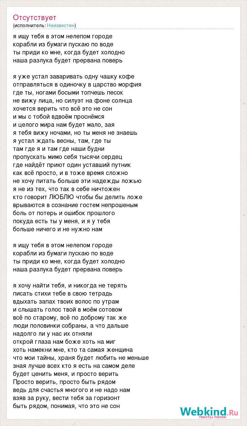 я ищу тебя в этом нелепом городе корабли из бумаги пускаю по воде ты приди ко мне, когда будет холодно наша разлука будет прервана поверь я уже устал заваривать одну чашку кофе отправляться в одиночку в царство морфия где ты, ногами босыми топчешь песок не вижу лица, но силуэт на фоне солнца хочется верить что всё это не сон и мы с тобой вдвоём проснёмся и целого мира нам будет мало, зая я тебя вижу ночами, но ты меня не знаешь я устал ждать весны, там, где ты там где я и там где наши будни пропускать мимо себя тысячи сердец где найдёт приют один уставший путник как всё просто, и в тоже время сложно не хочу питать больше эти надежды ложью я не из тех, что так в себе ничтожен кто говорит ЛЮБЛЮ чтобы бы делить ложе врываются в сознание гостем непрошеным боль от потерь и ошибок прошлого покуда есть ты у меня, и я у тебя больше ничего и не нужно нам я ищу тебя в этом нелепом городе корабли из бумаги пускаю по воде ты приди ко мне, когда будет холодно наша разлука будет прервана поверь я хочу найти тебя, и никогда не терять писать стихи тебе в свою тетрадь вдыхать запах твоих волос по утрам и слышать голос твой в моём сотовом всё по старому, всё по доброму так же люди половинки собраны, а что дальше надолго ли у нас их отняли открой глаза нам боже хоть на миг хоть намекни мне, кто та самая женщина что мои тайны, храня будет любить не меньше зная лучше всех кто я есть на самом деле будет ценить меня, и просто верить Просто верить, просто быть рядом ведь для счастья многого и не надо нам взяв за руку, вести тебя за горизонт быть рядом, понимая, что это не сон