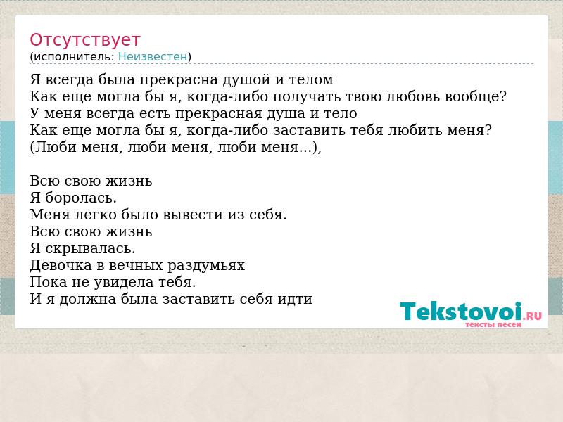 Я всегда была прекрасна душой и телом Как еще могла бы я, когда-либо получать твою любовь вообще? У меня всегда есть прекрасная душа и тело Как еще могла бы я, когда-либо заставить тебя любить меня? (Люби меня, люби меня, люби меня...), Всю свою жизнь Я боролась. Меня легко было вывести из себя. Всю свою жизнь Я скрывалась. Девочка в вечных раздумьях Пока не увидела тебя. И я должна была заставить себя идти