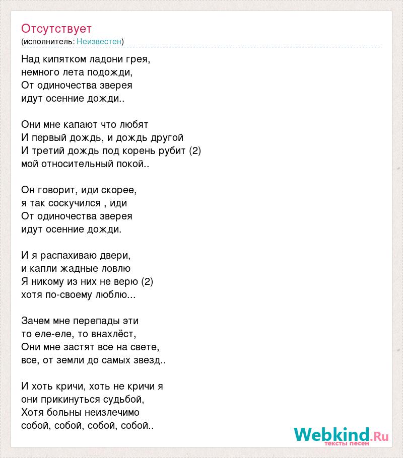 Над кипятком ладони грея, немного лета подожди, От одиночества зверея идут осенние дожди.. Они мне капают что любят И первый дождь, и дождь другой И третий дождь под корень рубит (2) мой относительный покой.. Он говорит, иди скорее, я так соскучился , иди От одиночества зверея идут осенние дожди. И я распахиваю двери, и капли жадные ловлю Я никому из них не верю (2) хотя по-своему люблю... Зачем мне перепады эти то еле-еле, то внахлёст, Они мне застят все на свете, все, от земли до самых звезд.. И хоть кричи, хоть не кричи я они прикинуться судьбой, Хотя больны неизлечимо собой, собой, собой, собой..