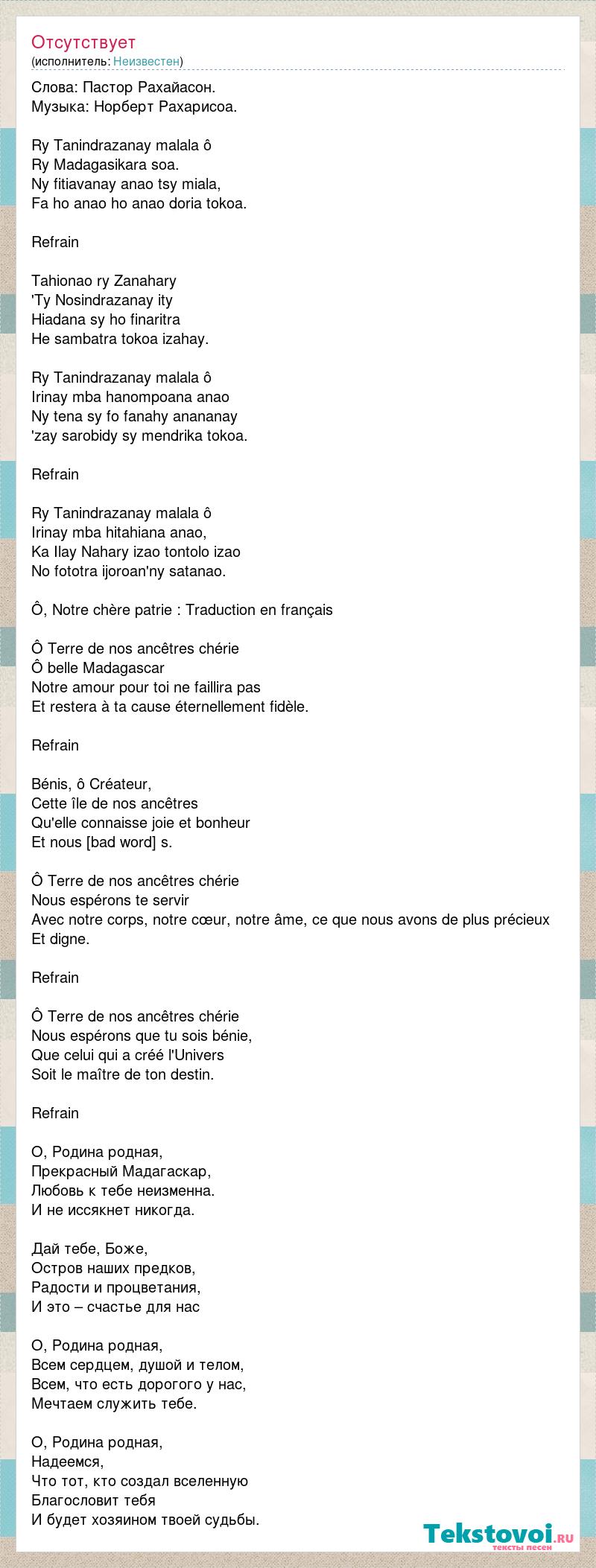 Слова: Пастор Рахайасон. Музыка: Норберт Рахарисоа. Ry Tanindrazanay malala ô Ry Madagasikara soa. Ny fitiavanay anao tsy miala, Fa ho anao ho anao doria tokoa. Refrain Tahionao ry Zanahary 'Ty Nosindrazanay ity Hiadana sy ho finaritra He sambatra tokoa izahay. Ry Tanindrazanay malala ô Irinay mba hanompoana anao Ny tena sy fo fanahy anananay 'zay sarobidy sy mendrika tokoa. Refrain Ry Tanindrazanay malala ô Irinay mba hitahiana anao, Ka Ilay Nahary izao tontolo izao No fototra ijoroan'ny satanao. Ô, Notre chère patrie : Traduction en français Ô Terre de nos ancêtres chérie Ô belle Madagascar Notre amour pour toi ne faillira pas Et restera à ta cause éternellement fidèle. Refrain Bénis, ô Créateur, Cette île de nos ancêtres Qu'elle connaisse joie et bonheur Et nous [bad word] s. Ô Terre de nos ancêtres chérie Nous espérons te servir Avec notre corps, notre cœur, notre âme, ce que nous avons de plus précieux Et digne. Refrain Ô Terre de nos ancêtres chérie Nous espérons que tu sois bénie, Que celui qui a créé l'Univers Soit le maître de ton destin. Refrain О, Родина родная, Прекрасный Мадагаскар, Любовь к тебе неизменна. И не иссякнет никогда. Дай тебе, Боже, Остров наших предков, Радости и процветания, И это – счастье для нас О, Родина родная, Всем сердцем, душой и телом, Всем, что есть дорогого у нас, Мечтаем служить тебе. О, Родина родная, Надеемся, Что тот, кто создал вселенную Благословит тебя И будет хозяином твоей судьбы.