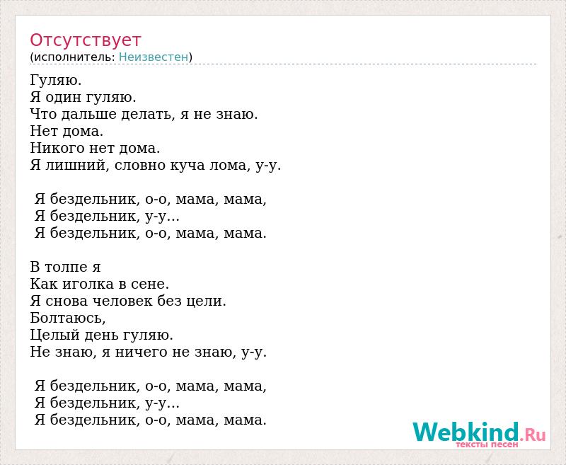 Гуляю. Я один гуляю. Что дальше делать, я не знаю. Нет дома. Никого нет дома. Я лишний, словно куча лома, у-у. Я бездельник, о-о, мама, мама, Я бездельник, у-у... Я бездельник, о-о, мама, мама. В толпе я Как иголка в сене. Я снова человек без цели. Болтаюсь, Целый день гуляю. Не знаю, я ничего не знаю, у-у. Я бездельник, о-о, мама, мама, Я бездельник, у-у... Я бездельник, о-о, мама, мама.