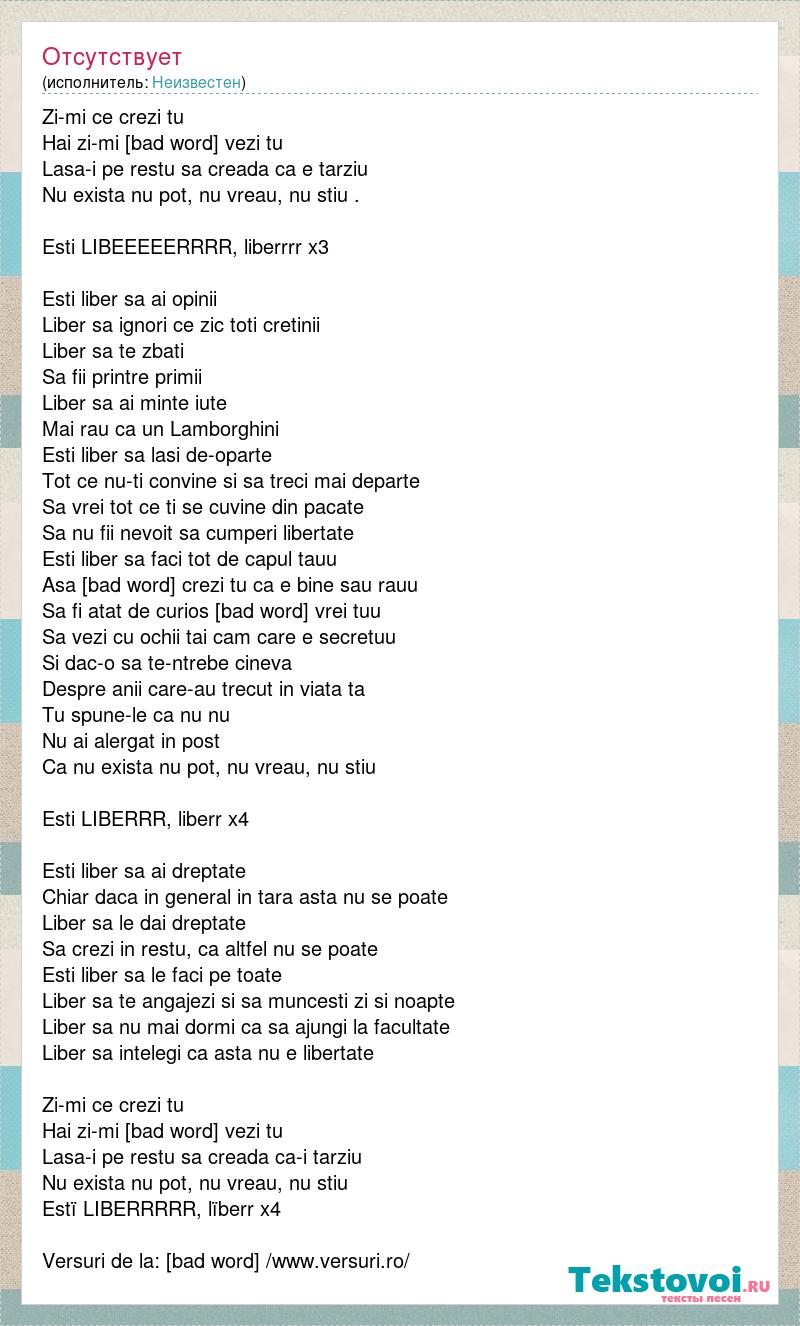 Zi-mi ce crezi tu Hai zi-mi [bad word] vezi tu Lasa-i pe restu sa creada ca e tarziu Nu exista nu pot, nu vreau, nu stiu . Esti LIBEEEEERRRR, liberrrr x3 Esti liber sa ai opinii Liber sa ignori ce zic toti cretinii Liber sa te zbati Sa fii printre primii Liber sa ai minte iute Mai rau ca un Lamborghini Esti liber sa lasi de-oparte Tot ce nu-ti convine si sa treci mai departe Sa vrei tot ce ti se cuvine din pacate Sa nu fii nevoit sa cumperi libertate Esti liber sa faci tot de capul tauu Asa [bad word] crezi tu ca e bine sau rauu Sa fi atat de curios [bad word] vrei tuu Sa vezi cu ochii tai cam care e secretuu Si dac-o sa te-ntrebe cineva Despre anii care-au trecut in viata ta Tu spune-le ca nu nu Nu ai alergat in post Ca nu exista nu pot, nu vreau, nu stiu Esti LIBERRR, liberr x4 Esti liber sa ai dreptate Chiar daca in general in tara asta nu se poate Liber sa le dai dreptate Sa crezi in restu, ca altfel nu se poate Esti liber sa le faci pe toate Liber sa te angajezi si sa muncesti zi si noapte Liber sa nu mai dormi ca sa ajungi la facultate Liber sa intelegi ca asta nu e libertate Zi-mi ce crezi tu Hai zi-mi [bad word] vezi tu Lasa-i pe restu sa creada ca-i tarziu Nu exista nu pot, nu vreau, nu stiu Estï LIBERRRRR, lïberr x4 Versuri de la: [bad word] /www.versuri.ro/
