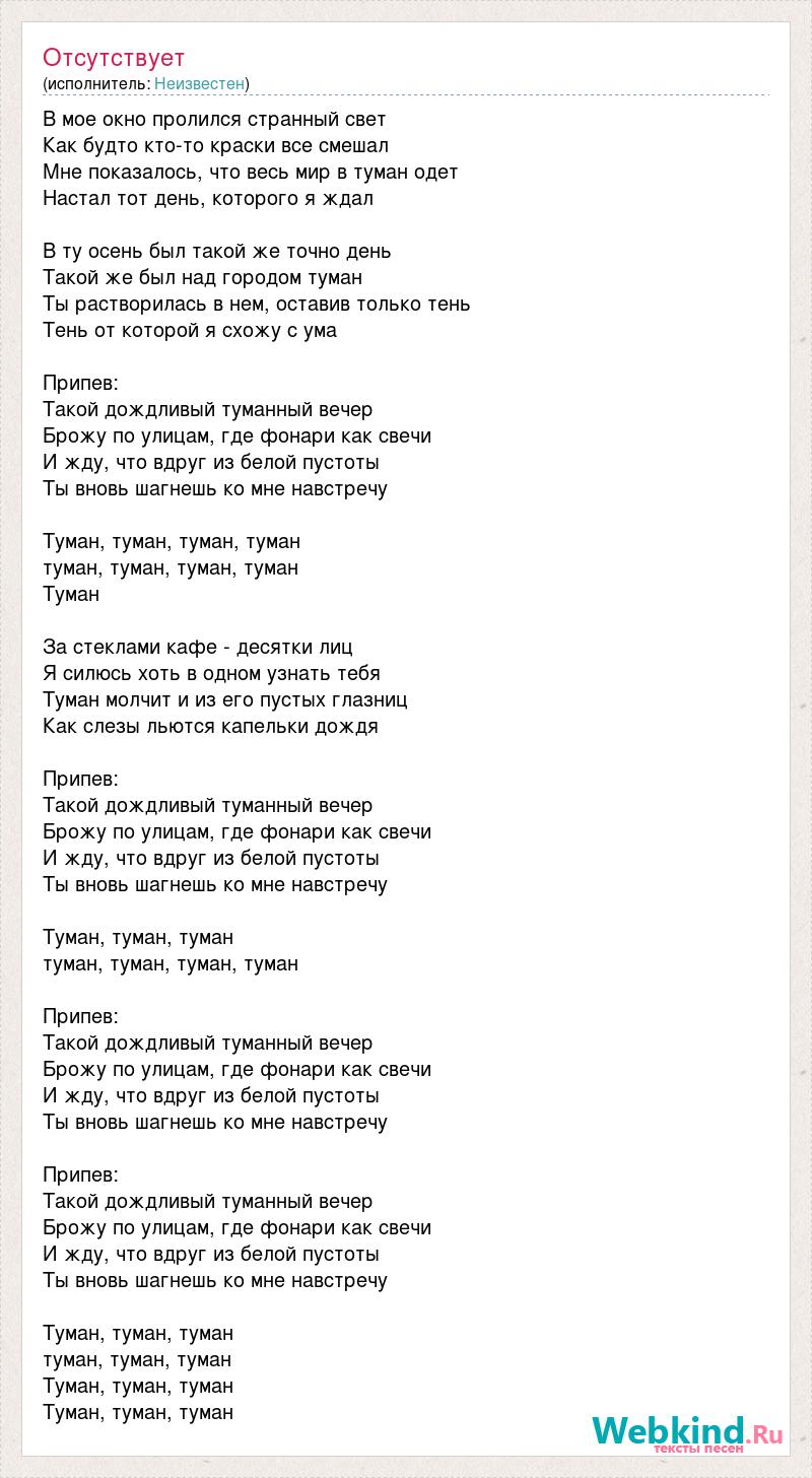 В мое окно пролился странный свет Как будто кто-то краски все смешал Мне показалось, что весь мир в туман одет Настал тот день, которого я ждал В ту осень был такой же точно день Такой же был над городом туман Ты растворилась в нем, оставив только тень Тень от которой я схожу с ума Припев: Такой дождливый туманный вечер Брожу по улицам, где фонари как свечи И жду, что вдруг из белой пустоты Ты вновь шагнешь ко мне навстречу Туман, туман, туман, туман туман, туман, туман, туман Туман За стеклами кафе - десятки лиц Я силюсь хоть в одном узнать тебя Туман молчит и из его пустых глазниц Как слезы льются капельки дождя Припев: Такой дождливый туманный вечер Брожу по улицам, где фонари как свечи И жду, что вдруг из белой пустоты Ты вновь шагнешь ко мне навстречу Туман, туман, туман туман, туман, туман, туман Припев: Такой дождливый туманный вечер Брожу по улицам, где фонари как свечи И жду, что вдруг из белой пустоты Ты вновь шагнешь ко мне навстречу Припев: Такой дождливый туманный вечер Брожу по улицам, где фонари как свечи И жду, что вдруг из белой пустоты Ты вновь шагнешь ко мне навстречу Туман, туман, туман туман, туман, туман Туман, туман, туман Туман, туман, туман