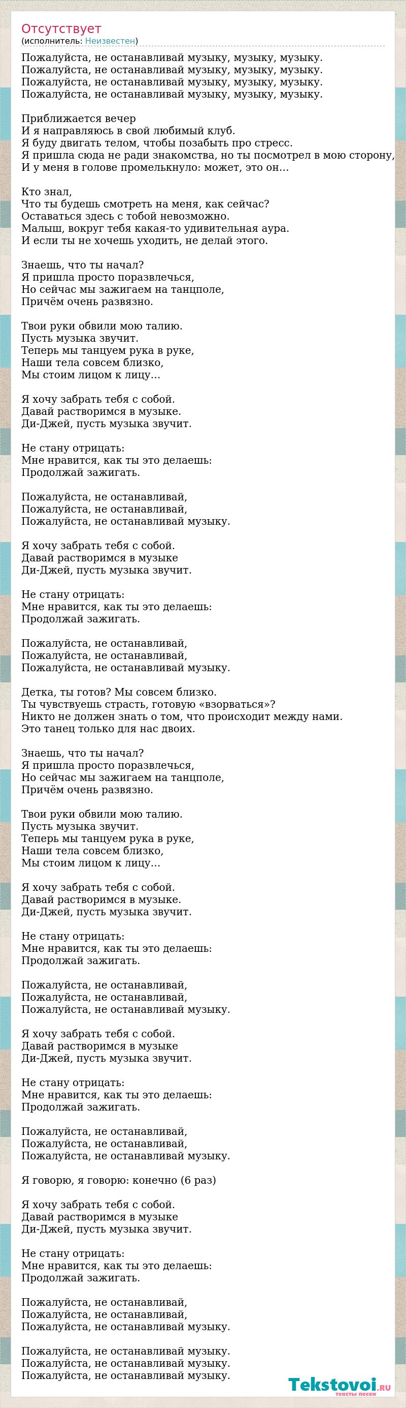 Пожалуйста, не останавливай музыку, музыку, музыку. Пожалуйста, не останавливай музыку, музыку, музыку. Пожалуйста, не останавливай музыку, музыку, музыку. Пожалуйста, не останавливай музыку, музыку, музыку. Приближается вечер И я направляюсь в свой любимый клуб. Я буду двигать телом, чтобы позабыть про стресс. Я пришла сюда не ради знакомства, но ты посмотрел в мою сторону, И у меня в голове промелькнуло: может, это он… Кто знал, Что ты будешь смотреть на меня, как сейчас? Оставаться здесь с тобой невозможно. Малыш, вокруг тебя какая-то удивительная аура. И если ты не хочешь уходить, не делай этого. Знаешь, что ты начал? Я пришла просто поразвлечься, Но сейчас мы зажигаем на танцполе, Причём очень развязно. Твои руки обвили мою талию. Пусть музыка звучит. Теперь мы танцуем рука в руке, Наши тела совсем близко, Мы стоим лицом к лицу… Я хочу забрать тебя с собой. Давай растворимся в музыке. Ди-Джей, пусть музыка звучит. Не стану отрицать: Мне нравится, как ты это делаешь: Продолжай зажигать. Пожалуйста, не останавливай, Пожалуйста, не останавливай, Пожалуйста, не останавливай музыку. Я хочу забрать тебя с собой. Давай растворимся в музыке Ди-Джей, пусть музыка звучит. Не стану отрицать: Мне нравится, как ты это делаешь: Продолжай зажигать. Пожалуйста, не останавливай, Пожалуйста, не останавливай, Пожалуйста, не останавливай музыку. Детка, ты готов? Мы совсем близко. Ты чувствуешь страсть, готовую «взорваться»? Никто не должен знать о том, что происходит между нами. Это танец только для нас двоих. Знаешь, что ты начал? Я пришла просто поразвлечься, Но сейчас мы зажигаем на танцполе, Причём очень развязно. Твои руки обвили мою талию. Пусть музыка звучит. Теперь мы танцуем рука в руке, Наши тела совсем близко, Мы стоим лицом к лицу… Я хочу забрать тебя с собой. Давай растворимся в музыке. Ди-Джей, пусть музыка звучит. Не стану отрицать: Мне нравится, как ты это делаешь: Продолжай зажигать. Пожалуйста, не останавливай, Пожалуйста, не останавливай, Пожалуйста, не останавливай музыку. Я хочу забрать тебя с собой. Давай растворимся в музыке Ди-Джей, пусть музыка звучит. Не стану отрицать: Мне нравится, как ты это делаешь: Продолжай зажигать. Пожалуйста, не останавливай, Пожалуйста, не останавливай, Пожалуйста, не останавливай музыку. Я говорю, я говорю: конечно (6 раз) Я хочу забрать тебя с собой. Давай растворимся в музыке Ди-Джей, пусть музыка звучит. Не стану отрицать: Мне нравится, как ты это делаешь: Продолжай зажигать. Пожалуйста, не останавливай, Пожалуйста, не останавливай, Пожалуйста, не останавливай музыку. Пожалуйста, не останавливай музыку. Пожалуйста, не останавливай музыку. Пожалуйста, не останавливай музыку.