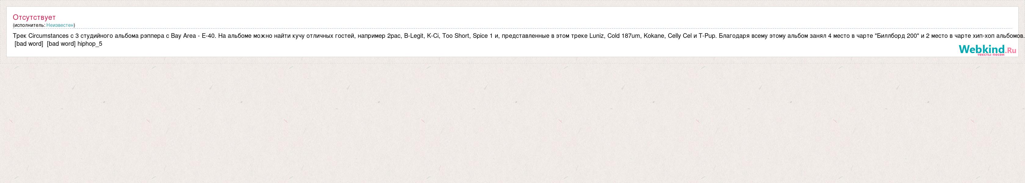 Трек Circumstances с 3 студийного альбома рэппера с Bay Area - E-40. На альбоме можно найти кучу отличных гостей, например 2pac, B-Legit, K-Ci, Too Short, Spice 1 и, представленные в этом треке Luniz, Cold 187um, Kokane, Celly Cel и T-Pup. Благодаря всему этому альбом занял 4 место в чарте "Биллборд 200" и 2 место в чарте хип-хоп альбомов. [bad word] [bad word] hiphop_5
