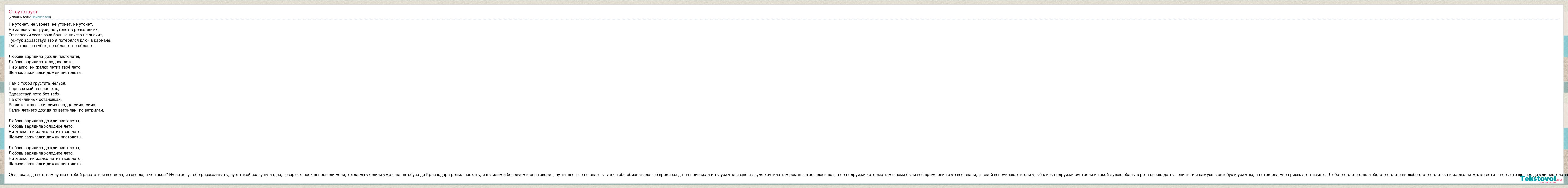 Она такая, да вот, нам лучше с тобой расстаться все дела, я говорю, а чё такое? Ну не хочу тебе рассказывать, ну я такой сразу ну ладно, говорю, я поехал проводи меня, когда мы уходили уже я на автобусе до Краснодара решил поехать, и мы идём и беседуем и она говорит, ну ты многого не знаешь там я тебя обманывала всё время когда ты приезжал и ты уезжал я ещё с двумя крутила там роман встречалась вот, а её подружки которые там с нами были всё время они тоже всё знали, я такой вспоминаю как они улыбались подружки смотрели и такой думаю ёбаны в рот говорю да ты гонишь, и я сажусь в автобус и уезжаю, а потом она мне присылает письмо... Любо-о-о-о-о-о-о-вь любо-о-о-о-о-о-о-вь любо-о-о-о-о-о-о-вь ни жалко ни жалко летит твоё лето щелчок дожди пистолеты