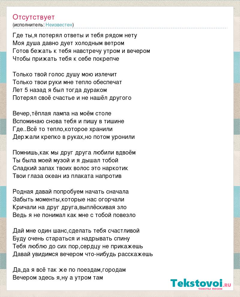 Где ты,я потерял ответы и тебя рядом нету Моя душа давно дует холодным ветром Готов бежать к тебя навстречу утром и вечером Чтобы прижать тебя к себе покрепче Только твой голос душу мою излечит Только твои руки мне тепло обеспечат Лет 5 назад я был тогда дураком Потерял своё счастье и не нашёл другого Вечер,тёплая лампа на моём столе Вспоминаю снова тебя и пишу в тишине Где..Всё то тепло,которое хранили Держали крепко в руках,но потом уронили Помнишь,как мы друг друга любили вдвоём Ты была моей музой и я дышал тобой Сладкий запах твоих волос это наркотик Твои глаза океан из плаката напротив Родная давай попробуем начать сначала Забыть моменты,которые нас огорчали Кричали на друг друга,выплёскивая зло Ведь я не понимал как мне с тобой повезло Дай мне один шанс,сделать тебя счастливой Буду очень стараться и надрывать спину Тебя люблю до сих пор,сердцу не прикажешь Давай увидимся вечером что-нибудь расскажешь Да,да я всё так же по поездам,городам Вечером здесь я,ну а утром там