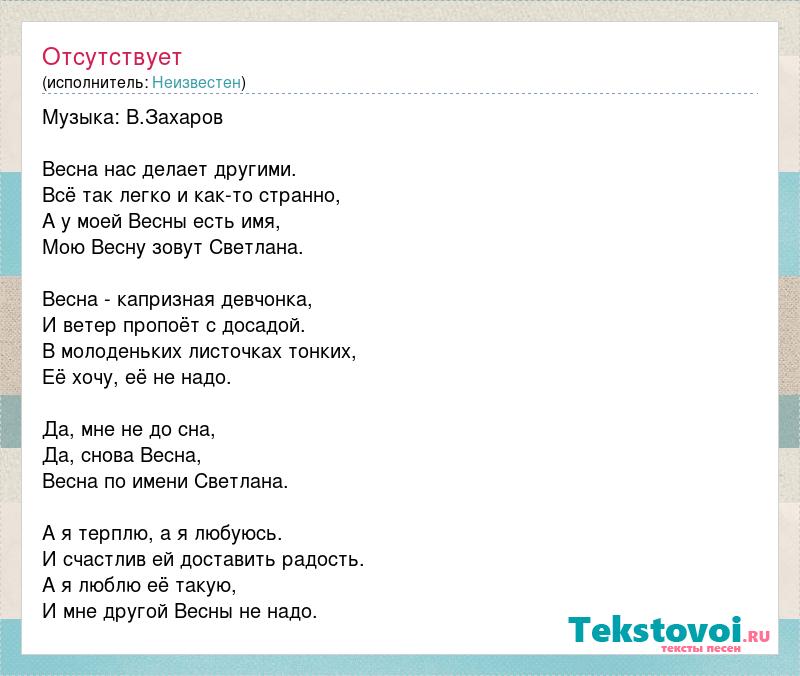 Музыка: В.Захаров Весна нас делает другими. Всё так легко и как-то странно, А у моей Весны есть имя, Мою Весну зовут Светлана. Весна - капризная девчонка, И ветер пропоёт с досадой. В молоденьких листочках тонких, Её хочу, её не надо. Да, мне не до сна, Да, снова Весна, Весна по имени Светлана. А я терплю, а я любуюсь. И счастлив ей доставить радость. А я люблю её такую, И мне другой Весны не надо.