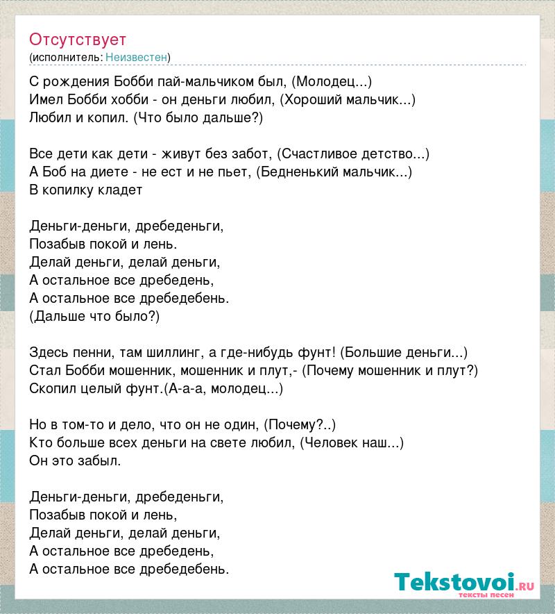 С рождения Бобби пай-мальчиком был, (Молодец...) Имел Бобби хобби - он деньги любил, (Хороший мальчик...) Любил и копил. (Что было дальше?) Все дети как дети - живут без забот, (Счастливое детство...) А Боб на диете - не ест и не пьет, (Бедненький мальчик...) В копилку кладет Деньги-деньги, дребеденьги, Позабыв покой и лень. Делай деньги, делай деньги, А остальное все дребедень, А остальное все дребедебень. (Дальше что было?) Здесь пенни, там шиллинг, а где-нибудь фунт! (Большие деньги...) Стал Бобби мошенник, мошенник и плут,- (Почему мошенник и плут?) Скопил целый фунт.(А-а-а, молодец...) Но в том-то и дело, что он не один, (Почему?..) Кто больше всех деньги на свете любил, (Человек наш...) Он это забыл. Деньги-деньги, дребеденьги, Позабыв покой и лень, Делай деньги, делай деньги, А остальное все дребедень, А остальное все дребедебень.