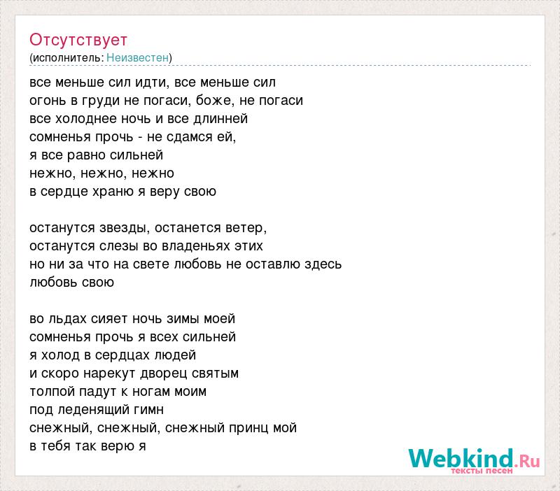 все меньше сил идти, все меньше сил огонь в груди не погаси, боже, не погаси все холоднее ночь и все длинней сомненья прочь - не сдамся ей, я все равно сильней нежно, нежно, нежно в сердце храню я веру свою останутся звезды, останется ветер, останутся слезы во владеньях этих но ни за что на свете любовь не оставлю здесь любовь свою во льдах сияет ночь зимы моей сомненья прочь я всех сильней я холод в сердцах людей и скоро нарекут дворец святым толпой падут к ногам моим под леденящий гимн снежный, снежный, снежный принц мой в тебя так верю я