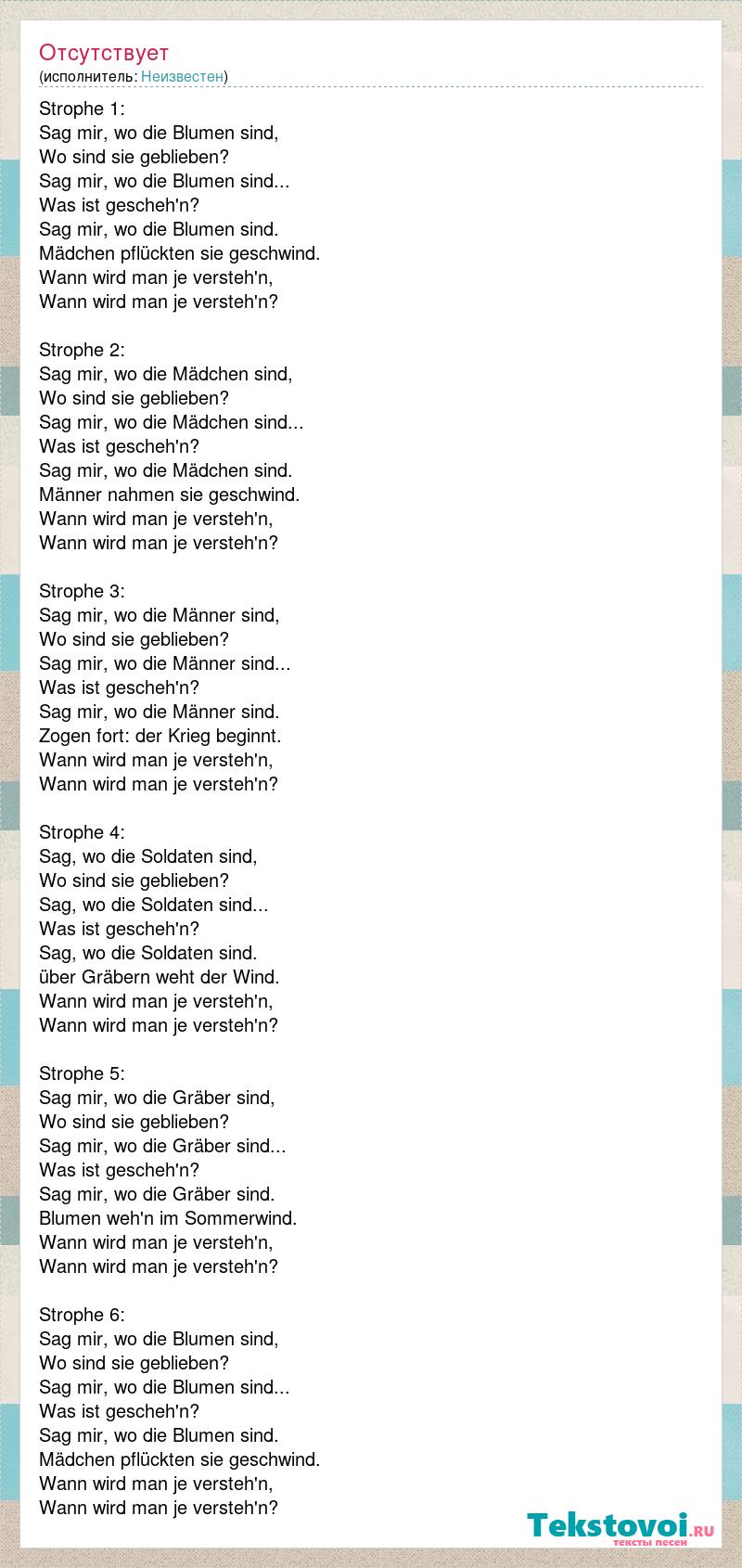 Strophe 1: Sag mir, wo die Blumen sind, Wo sind sie geblieben? Sag mir, wo die Blumen sind... Was ist gescheh'n? Sag mir, wo die Blumen sind. Mädchen pflückten sie geschwind. Wann wird man je versteh'n, Wann wird man je versteh'n? Strophe 2: Sag mir, wo die Mädchen sind, Wo sind sie geblieben? Sag mir, wo die Mädchen sind... Was ist gescheh'n? Sag mir, wo die Mädchen sind. Männer nahmen sie geschwind. Wann wird man je versteh'n, Wann wird man je versteh'n? Strophe 3: Sag mir, wo die Männer sind, Wo sind sie geblieben? Sag mir, wo die Männer sind... Was ist gescheh'n? Sag mir, wo die Männer sind. Zogen fort: der Krieg beginnt. Wann wird man je versteh'n, Wann wird man je versteh'n? Strophe 4: Sag, wo die Soldaten sind, Wo sind sie geblieben? Sag, wo die Soldaten sind... Was ist gescheh'n? Sag, wo die Soldaten sind. über Gräbern weht der Wind. Wann wird man je versteh'n, Wann wird man je versteh'n? Strophe 5: Sag mir, wo die Gräber sind, Wo sind sie geblieben? Sag mir, wo die Gräber sind... Was ist gescheh'n? Sag mir, wo die Gräber sind. Blumen weh'n im Sommerwind. Wann wird man je versteh'n, Wann wird man je versteh'n? Strophe 6: Sag mir, wo die Blumen sind, Wo sind sie geblieben? Sag mir, wo die Blumen sind... Was ist gescheh'n? Sag mir, wo die Blumen sind. Mädchen pflückten sie geschwind. Wann wird man je versteh'n, Wann wird man je versteh'n?