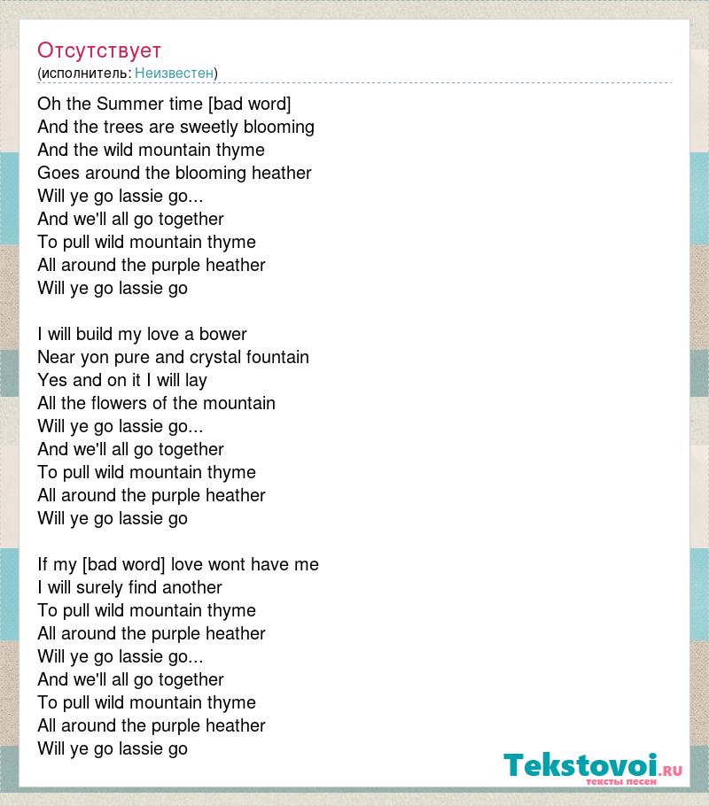 Oh the Summer time [bad word] And the trees are sweetly blooming And the wild mountain thyme Goes around the blooming heather Will ye go lassie go... And we'll all go together To pull wild mountain thyme All around the purple heather Will ye go lassie go I will build my love a bower Near yon pure and crystal fountain Yes and on it I will lay All the flowers of the mountain Will ye go lassie go... And we'll all go together To pull wild mountain thyme All around the purple heather Will ye go lassie go If my [bad word] love wont have me I will surely find another To pull wild mountain thyme All around the purple heather Will ye go lassie go... And we'll all go together To pull wild mountain thyme All around the purple heather Will ye go lassie go