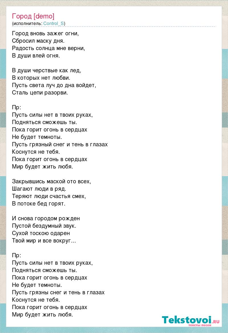 Город вновь зажег огни, Сбросил маску дня. Радость солнца мне верни, В души влей огня. В души черствые как лед, В которых нет любви. Пусть света луч до дна войдет, Сталь цепи разорви. Пр: Пусть силы нет в твоих руках, Подняться сможешь ты. Пока горит огонь в сердцах Не будет темноты. Пусть грязный снег и тень в глазах Коснутся не тебя. Пока горит огонь в сердцах Мир будет жить любя. Закрывшись маской ото всех, Шагают люди в ряд. Теряют люди счастья смех, В потоке бед горят. И снова городом рожден Пустой бездумный звук. Сухой тоскою одарен Твой мир и все вокруг... Пр: Пусть силы нет в твоих руках, Подняться сможешь ты. Пока горит огонь в сердцах Не будет темноты. Пусть грязны снег и тень в глазах Коснутся не тебя. Пока горит огонь в сердцах Мир будет жить любя.