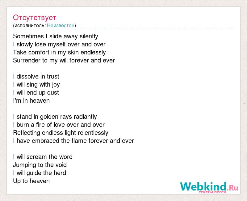 Sometimes I slide away silently I slowly lose myself over and over [bad word] in my skin endlessly Surrender to my will forever and ever I dissolve in [bad word] I will sing with joy I will end up dust I'm in heaven I stand in golden rays radiantly I burn a fire of love over and over Reflecting endless light relentlessly I have embraced the flame forever and ever I will scream the word Jumping to the void I will guide the herd Up to heaven