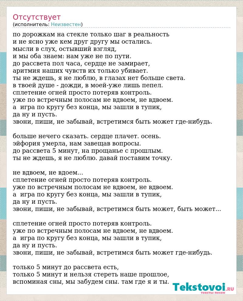 по дорожкам на стекле только шаг в реальность и не ясно уже кем друг другу мы остались. мысли в слух, остывший взгляд, и мы оба знаем: нам уже не по пути. до рассвета пол часа, сердце не замирает, аритмия наших чувств их только убивает. ты не ждешь, я не люблю, в глазах нет больше света. в твоей душе - дожди, в моей-уже лишь пепел. сплетение огней просто потеряв контроль. уже по встречным полосам не вдвоем, не вдвоем. а игра по кругу без конца, мы зашли в тупик, да ну и пусть. звони, пиши, не забывай, встретимся быть может где-нибудь. больше нечего сказать. сердце плачет. осень. эйфория умерла, нам завещав вопросы. до рассвета 5 минут, на прощанье с прошлым. ты не ждешь, я не люблю. давай поставим точку. не вдвоем, не вдоем... сплетение огней просто потеряв контроль. уже по встречным полосам не вдвоем, не вдвоем. а игра по кругу без конца, мы зашли в тупик, да ну и пусть. звони, пиши, не забывай, встретимся быть может, быть может... сплетение огней просто потеряв контроль. уже по встречным полосам не вдвоем, не вдвоем. а игра по кругу без конца, мы зашли в тупик, да ну и пусть. звони, пиши, не забывай, встретимся быть может где-нибудь. только 5 минут до рассвета есть, только 5 минут и нельзя стереть наше прошлое, вспоминая сны, мы забудем сны. там где я и ты.