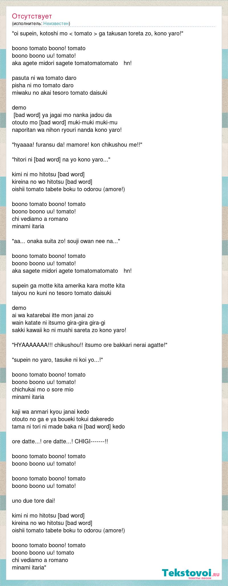 "oi supein, kotoshi mo < tomato > ga takusan toreta zo, kono yaro!" boono tomato boono! tomato boono boono uu! tomato! aka agete midori sagete tomatomatomato hn! pasuta ni wa tomato daro pisha ni mo tomato daro miwaku no akai tesoro tomato daisuki demo [bad word] ya jagai mo nanka jadou da otouto mo [bad word] muki-muki muki-mu naporitan wa nihon ryouri nanda kono yaro! "hyaaaa! furansu da! mamore! kon chikushou me!!" "hitori ni [bad word] na yo kono yaro..." kimi ni mo hitotsu [bad word] kireina no wo hitotsu [bad word] oishii tomato tabete boku to odorou (amore!) boono tomato boono! tomato boono boono uu! tomato! chi vediamo a romano minami itaria "aa... onaka suita zo! souji owan nee na..." boono tomato boono! tomato boono boono uu! tomato! aka sagete midori agete tomatomatomato hn! supein ga motte kita amerika kara motte kita taiyou no kuni no tesoro tomato daisuki demo ai wa katarebai itte mon janai zo wain katate ni itsumo gira-gira gira-gi sakki kawaii ko ni mushi sareta zo kono yaro! "HYAAAAAAA!!! chikushou!! itsumo ore bakkari nerai agatte!" "supein no yaro, tasuke ni koi yo...!" boono tomato boono! tomato boono boono uu! tomato! chichukai mo o sore mio minami itaria kaji wa anmari kyou janai kedo otouto no ga e ya boueki tokui dakeredo tama ni tori ni made baka ni [bad word] kedo ore datte...! ore datte...! CHIGI-------!! boono tomato boono! tomato boono boono uu! tomato! boono tomato boono! tomato boono boono uu! tomato! uno due tore dai! kimi ni mo hitotsu [bad word] kireina no wo hitotsu [bad word] oishii tomato tabete boku to odorou (amore!) boono tomato boono! tomato boono boono uu! tomato chi vediamo a romano minami itaria"