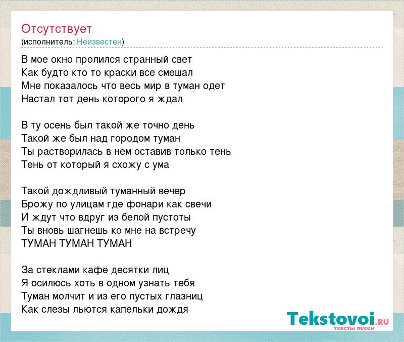 В мое окно пролился странный свет Как будто кто то краски все смешал Мне показалось что весь мир в туман одет Настал тот день которого я ждал В ту осень был такой же точно день Такой же был над городом туман Ты растворилась в нем оставив только тень Тень от который я схожу с ума Такой дождливый туманный вечер Брожу по улицам где фонари как свечи И ждут что вдруг из белой пустоты Ты вновь шагнешь ко мне на встречу ТУМАН ТУМАН ТУМАН За стеклами кафе десятки лиц Я осилюсь хоть в одном узнать тебя Туман молчит и из его пустых глазниц Как слезы льются капельки дождя