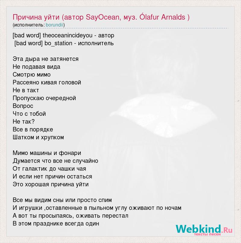 [bad word] theoceanincideyou - автор [bad word] bo_station - исполнитель Эта дыра не затянется Не подавая вида Смотрю мимо Рассеяно кивая головой Не в такт Пропускаю очередной Вопрос Что с тобой Не так? Все в порядке Шатком и хрупком Мимо машины и фонари Думается что все не случайно От галактик до чашки чая И если нет причин остаться Это хорошая причина уйти Все мы видим сны или просто спим И игрушки ,оставленные в пыльном углу оживают по ночам А вот ты просыпаясь, оживать перестал В этом празднике всегда один