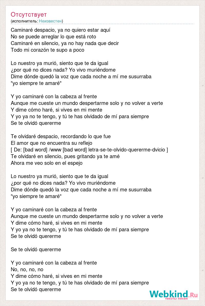 Caminaré despacio, ya no quiero estar aquí No se puede arreglar lo que está roto Caminaré en silencio, ya no hay nada que decir Todo mi corazón te supo a poco Lo nuestro ya murió, siento que te da igual ¿por qué no dices nada? Yo vivo muriéndome Dime dónde quedó la voz que cada noche a mí me susurraba "yo siempre te amaré" Y yo caminaré con la cabeza al frente Aunque me cueste un mundo despertarme solo y no volver a verte Y dime cómo haré, si vives en mi mente Y yo ya no te tengo, y tú te has olvidado de mí para siempre Se te olvidó quererme Te olvidaré despacio, recordando lo que fue El amor que no encuentra su reflejo [ De: [bad word] /www [bad word] letra-se-te-olvido-quererme-dvicio ] Te olvidaré en silencio, pues gritando ya te amé Ahora me veo solo en el espejo Lo nuestro ya murió, siento que te da igual ¿por qué no dices nada? Yo vivo muriéndome Dime dónde quedó la voz que cada noche a mí me susurraba "yo siempre te amaré" Y yo caminaré con la cabeza al frente Aunque me cueste un mundo despertarme solo y no volver a verte Y dime cómo haré, si vives en mi mente Y yo ya no te tengo, y tú te has olvidado de mí para siempre Se te olvidó quererme Se te olvidó quererme Y yo caminaré con la cabeza al frente No, no, no, no Y dime cómo haré, si vives en mi mente Y yo ya no te tengo, y tú te has olvidado de mí para siempre Se te olvidó quererme