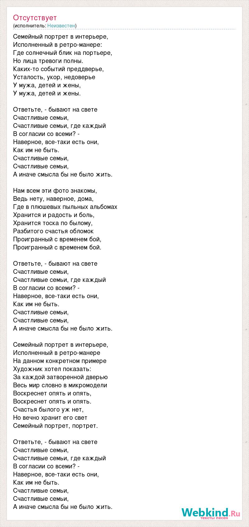 Семейный портрет в интерьере, Исполненный в ретро-манере: Где солнечный блик на портьере, Но лица тревоги полны. Каких-то событий преддверье, Усталость, укор, недоверье У мужа, детей и жены, У мужа, детей и жены. Ответьте, - бывают на свете Счастливые семьи, Счастливые семьи, где каждый В согласии со всеми? - Наверное, все-таки есть они, Как им не быть. Счастливые семьи, Счастливые семьи, А иначе смысла бы не было жить. Нам всем эти фото знакомы, Ведь нету, наверное, дома, Где в плюшевых пыльных альбомах Хранится и радость и боль, Хранится тоска по былому, Разбитого счастья обломок Проигранный с временем бой, Проигранный с временем бой. Ответьте, - бывают на свете Счастливые семьи, Счастливые семьи, где каждый В согласии со всеми? - Наверное, все-таки есть они, Как им не быть. Счастливые семьи, Счастливые семьи, А иначе смысла бы не было жить. Семейный портрет в интерьере, Исполненный в ретро-манере На данном конкретном примере Художник хотел показать: За каждой затворенной дверью Весь мир словно в микромодели Воскреснет опять и опять, Воскреснет опять и опять. Счастья былого уж нет, Но вечно хранит его свет Семейный портрет, портрет. Ответьте, - бывают на свете Счастливые семьи, Счастливые семьи, где каждый В согласии со всеми? - Наверное, все-таки есть они, Как им не быть. Счастливые семьи, Счастливые семьи, А иначе смысла бы не было жить.