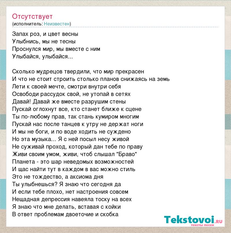 Запах роз, и цвет весны Улыбнись, мы не тесны Проснулся мир, мы вместе с ним Улыбайся, улыбайся... Сколько мудрецов твердили, что мир прекрасен И что не стоит строить столько планов снижаясь на земь Лети к своей мечте, смотри внутри себя Освободи рассудок свой, не утопай в сетях Давай! Давай же вместе разрушим стены Пускай оглохнут все, кто станет ближе к сцене Ты по-любому прав, так стань кумиром многим Пускай нас после танцев к утру не держат ноги И мы не боги, и по воде ходить не суждено Но эта музыка... Я с ней посыл несу живой Не суживай проход, который дан тебе по праву Живи своим умом, живи, чтоб слышал "Браво" Планета - это шар неведомых возможностей И щас найти тут в каждом в вас можно стиль Это не тождество, а аксиома дня Ты улыбнешься? Я знаю что сегодня да И если тебе плохо, нет настроения совсем Нещадная депрессия навеяла тоску на всех Я знаю что мне делать, вставая с койки В ответ проблемам двоеточие и скобка