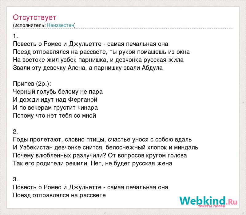 1. Повесть о Ромео и Джульетте - самая печальная она Поезд отправлялся на рассвете, ты рукой помашешь из окна На востоке жил узбек парнишка, и девчонка русская жила Звали эту девочку Алена, а парнишку звали Абдула Припев (2р.): Черный голубь белому не пара И дожди идут над Ферганой И по вечерам грустит чинара Потому что нет тебя со мной 2. Годы пролетают, словно птицы, счастье унося с собою вдаль И Узбекистан девчонке снится, белоснежный хлопок и миндаль Почему влюбленных разлучили? От вопросов кругом голова Так его родители решили. Нет, не будет русская жена 3. Повесть о Ромео и Джульетте - самая печальная она Поезд отправлялся на рассвете
