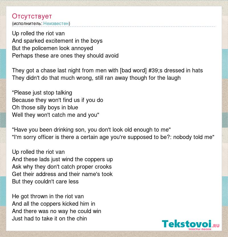 Up rolled the riot van And sparked excitement in the boys But the policemen look annoyed Perhaps these are ones they should avoid They got a chase last night from men with [bad word] #39;s dressed in hats They didn't do that much wrong, still ran away though for the laugh "Please just stop talking Because they won't find us if you do Oh those silly boys in blue Well they won't catch me and you" "Have you been drinking son, you don't look old enough to me" "I'm sorry officer is there a certain age you're supposed to be?: nobody told me" Up rolled the riot van And these lads just wind the coppers up Ask why they don't catch proper crooks Get their address and their name's took But they couldn't care less He got thrown in the riot van And all the coppers kicked him in And there was no way he could win Just had to take it on the chin