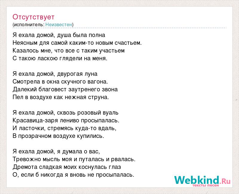 Я ехала домой, душа была полна Неясным для самой каким-то новым счастьем. Казалось мне, что все с таким участьем С такою ласкою глядели на меня. Я ехала домой, двурогая луна Смотрела в окна скучного вагона. Далекий благовест заутренего звона Пел в воздухе как нежная струна. Я ехала домой, сквозь розовый вуаль Красавица-заря лениво просыпалась. И ласточки, стремясь куда-то вдаль, В прозрачном воздухе купились. Я ехала домой, я думала о вас, Тревожно мысль моя и путалась и рвалась. Дремота сладкая моих коснулась глаз О, если б никогда я вновь не просыпалась.