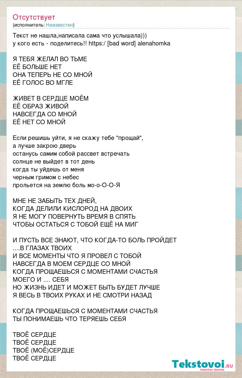 Текст не нашла,написала сама что услышала))) у кого есть - поделитесь!! https:/ [bad word] alenahomka Я ТЕБЯ ЖЕЛАЛ ВО ТЬМЕ ЕЁ БОЛЬШЕ НЕТ ОНА ТЕПЕРЬ НЕ СО МНОЙ ЕЁ ГОЛОС ВО МГЛЕ ЖИВЕТ В СЕРДЦЕ МОЁМ ЕЁ ОБРАЗ ЖИВОЙ НАВСЕГДА СО МНОЙ ЕЁ НЕТ СО МНОЙ Если решишь уйти, я не скажу тебе "прощай", а лучше закрою дверь останусь самим собой рассвет встречать солнце не выйдет в тот день когда ты уйдешь от меня черным гримом с небес прольется на землю боль мо-о-О-О-Я МНЕ НЕ ЗАБЫТЬ ТЕХ ДНЕЙ, КОГДА ДЕЛИЛИ КИСЛОРОД НА ДВОИХ Я НЕ МОГУ ПОВЕРНУТЬ ВРЕМЯ В СПЯТЬ ЧТОБЫ ОСТАТЬСЯ С ТОБОЙ ЕЩЁ НА МИГ И ПУСТЬ ВСЕ ЗНАЮТ, ЧТО КОГДА-ТО БОЛЬ ПРОЙДЕТ ....В ГЛАЗАХ ТВОИХ И ВСЕ МОМЕНТЫ ЧТО Я ПРОВЕЛ С ТОБОЙ НАВСЕГДА В МОЕМ СЕРДЦЕ СО МНОЙ КОГДА ПРОЩАЕШЬСЯ С МОМЕНТАМИ СЧАСТЬЯ МОЕГО И .... СЕБЯ НО ЖИЗНЬ ИДЕТ И МОЖЕТ БЫТЬ БУДЕТ ЛУЧШЕ Я ВЕСЬ В ТВОИХ РУКАХ И НЕ СМОТРИ НАЗАД КОГДА ПРОЩАЕШЬСЯ С МОМЕНТАМИ СЧАСТЬЯ ТЫ ПОНИМАЕШЬ ЧТО ТЕРЯЕШЬ СЕБЯ ТВОЁ СЕРДЦЕ ТВОЁ СЕРДЦЕ ТВОЁ (МОЁ)СЕРДЦЕ ТВОЁ СЕРДЦЕ