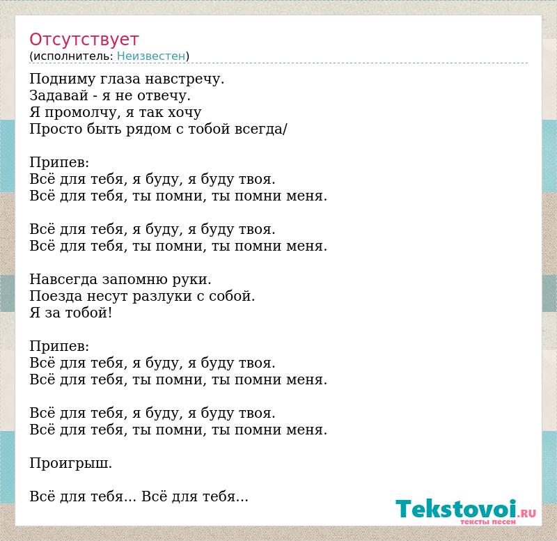 Подниму глаза навстречу. Задавай - я не отвечу. Я промолчу, я так хочу Просто быть рядом с тобой всегда/ Припев: Всё для тебя, я буду, я буду твоя. Всё для тебя, ты помни, ты помни меня. Всё для тебя, я буду, я буду твоя. Всё для тебя, ты помни, ты помни меня. Навсегда запомню руки. Поезда несут разлуки с собой. Я за тобой! Припев: Всё для тебя, я буду, я буду твоя. Всё для тебя, ты помни, ты помни меня. Всё для тебя, я буду, я буду твоя. Всё для тебя, ты помни, ты помни меня. Проигрыш. Всё для тебя... Всё для тебя...
