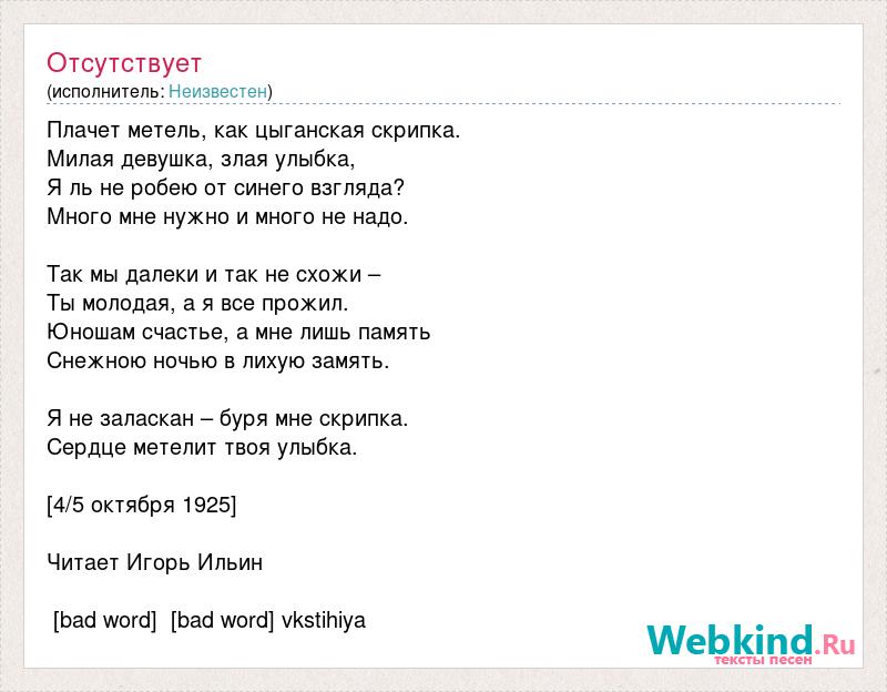 Плачет метель, как цыганская скрипка. Милая девушка, злая улыбка, Я ль не робею от синего взгляда? Много мне нужно и много не надо. Так мы далеки и так не схожи – Ты молодая, а я все прожил. Юношам счастье, а мне лишь память Снежною ночью в лихую замять. Я не заласкан – буря мне скрипка. Сердце метелит твоя улыбка. [4/5 октября 1925] Читает Игорь Ильин [bad word] [bad word] vkstihiya