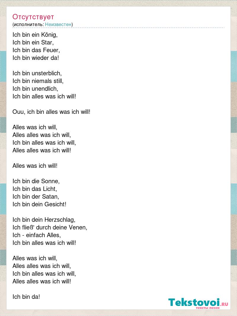 Ich bin ein König, Ich bin ein Star, Ich bin das Feuer, Ich bin wieder da! Ich bin unsterblich, Ich bin niemals still, Ich bin unendlich, Ich bin alles was ich will! Ouu, ich bin alles was ich will! Alles was ich will, Alles alles was ich will, Ich bin alles was ich will, Alles alles was ich will! Alles was ich will! Ich bin die Sonne, Ich bin das Licht, Ich bin der Satan, Ich bin dein Gesicht! Ich bin dein Herzschlag, Ich fließ' durch deine Venen, Ich - einfach Alles, Ich bin alles was ich will! Alles was ich will, Alles alles was ich will, Ich bin alles was ich will, Alles alles was ich will! Ich bin da!