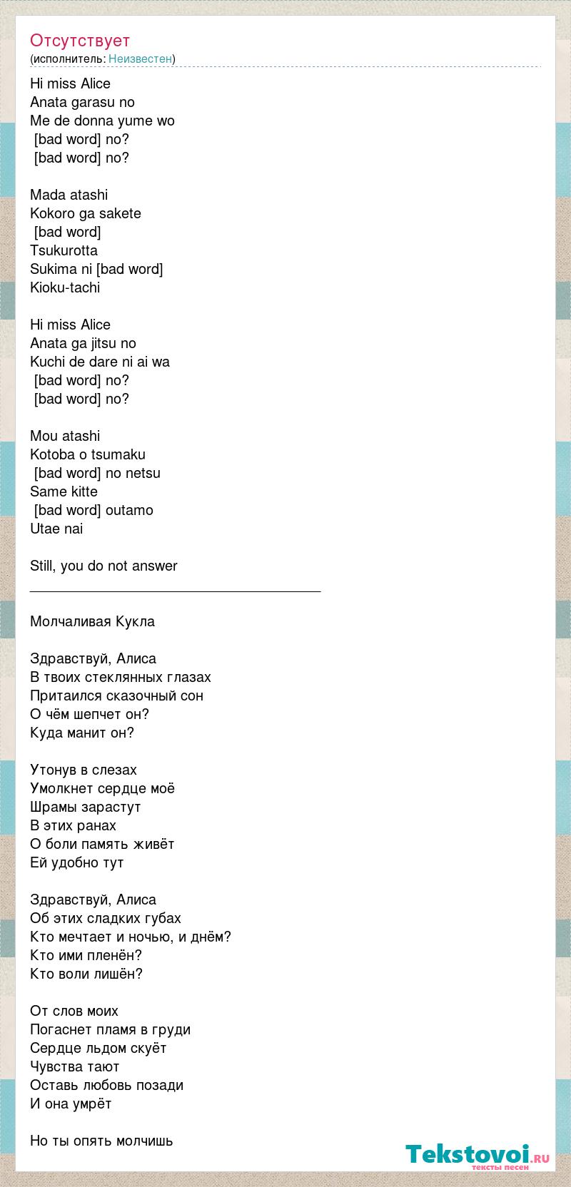Hi miss Alice Anata garasu no Me de donna yume wo [bad word] no? [bad word] no? Mada atashi Kokoro ga sakete [bad word] Tsukurotta Sukima ni [bad word] Kioku-tachi Hi miss Alice Anata ga jitsu no Kuchi de dare ni ai wa [bad word] no? [bad word] no? Mou atashi Kotoba o tsumaku [bad word] no netsu Same kitte [bad word] outamo Utae nai Still, you do not answer _____________________________________ Молчаливая Кукла Здравствуй, Алиса В твоих стеклянных глазах Притаился сказочный сон О чём шепчет он? Куда манит он? Утонув в слезах Умолкнет сердце моё Шрамы зарастут В этих ранах О боли память живёт Ей удобно тут Здравствуй, Алиса Об этих сладких губах Кто мечтает и ночью, и днём? Кто ими пленён? Кто воли лишён? От слов моих Погаснет пламя в груди Сердце льдом скуёт Чувства тают Оставь любовь позади И она умрёт Но ты опять молчишь