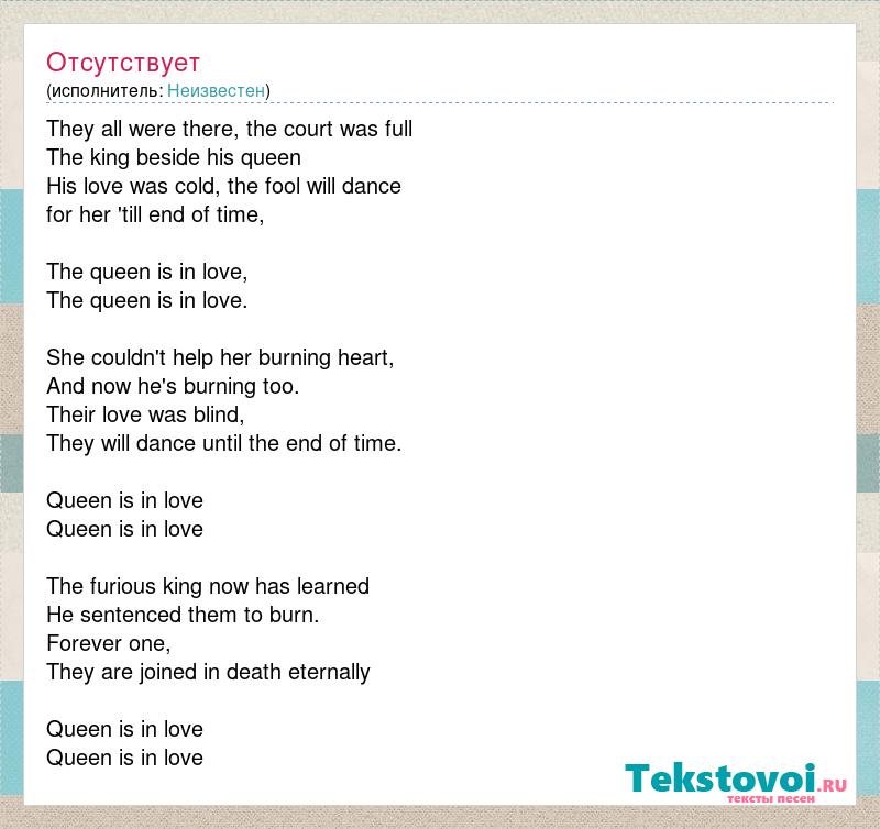 They all were there, the court was full The king beside his queen His love was cold, the fool will dance for her 'till end of time, The queen is in love, The queen is in love. She couldn't help her burning heart, And now he's burning too. Their love was blind, They will dance until the end of time. Queen is in love Queen is in love The furious king now has learned He sentenced them to burn. Forever one, They are joined in death eternally Queen is in love Queen is in love