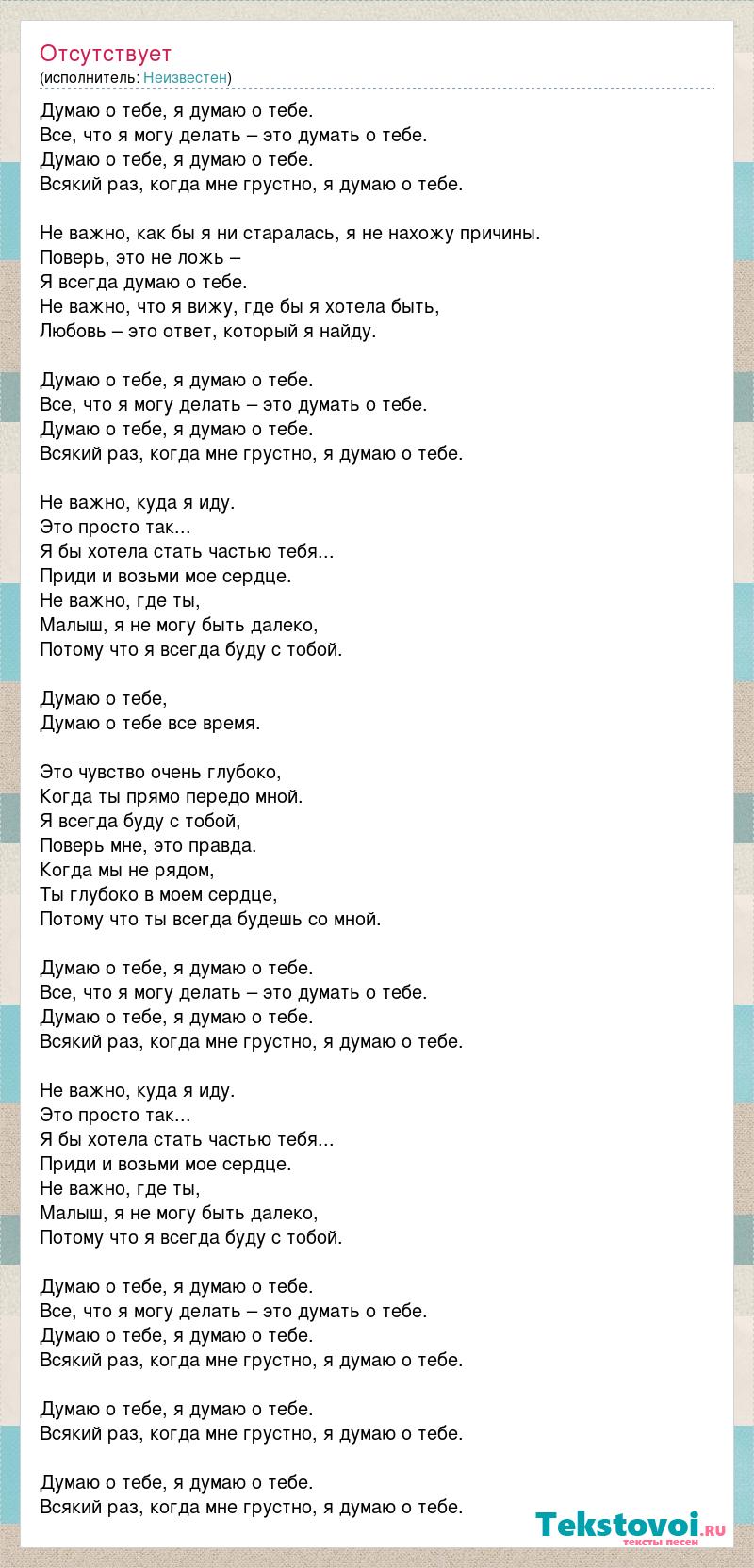 Думаю о тебе, я думаю о тебе. Все, что я могу делать – это думать о тебе. Думаю о тебе, я думаю о тебе. Всякий раз, когда мне грустно, я думаю о тебе. Не важно, как бы я ни старалась, я не нахожу причины. Поверь, это не ложь – Я всегда думаю о тебе. Не важно, что я вижу, где бы я хотела быть, Любовь – это ответ, который я найду. Думаю о тебе, я думаю о тебе. Все, что я могу делать – это думать о тебе. Думаю о тебе, я думаю о тебе. Всякий раз, когда мне грустно, я думаю о тебе. Не важно, куда я иду. Это просто так... Я бы хотела стать частью тебя... Приди и возьми мое сердце. Не важно, где ты, Малыш, я не могу быть далеко, Потому что я всегда буду с тобой. Думаю о тебе, Думаю о тебе все время. Это чувство очень глубоко, Когда ты прямо передо мной. Я всегда буду с тобой, Поверь мне, это правда. Когда мы не рядом, Ты глубоко в моем сердце, Потому что ты всегда будешь со мной. Думаю о тебе, я думаю о тебе. Все, что я могу делать – это думать о тебе. Думаю о тебе, я думаю о тебе. Всякий раз, когда мне грустно, я думаю о тебе. Не важно, куда я иду. Это просто так... Я бы хотела стать частью тебя... Приди и возьми мое сердце. Не важно, где ты, Малыш, я не могу быть далеко, Потому что я всегда буду с тобой. Думаю о тебе, я думаю о тебе. Все, что я могу делать – это думать о тебе. Думаю о тебе, я думаю о тебе. Всякий раз, когда мне грустно, я думаю о тебе. Думаю о тебе, я думаю о тебе. Всякий раз, когда мне грустно, я думаю о тебе. Думаю о тебе, я думаю о тебе. Всякий раз, когда мне грустно, я думаю о тебе.