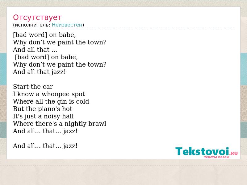 [bad word] on babe, Why don’t we paint the town? And all that ... [bad word] on babe, Why don’t we paint the town? And all that jazz! Start the car I know a whoopee spot Where all the gin is cold But the piano's hot It's just a noisy hall Where there's a nightly brawl And all... that... jazz! And all... that... jazz!