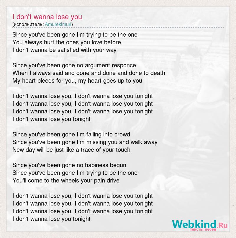 Since you've been gone I'm trying to be the one You always hurt the ones you love before I don't wanna be satisfied with your way Since you've been gone no argument responce When I always said and done and done and done to death My heart bleeds for you, my heart goes up to you I don't wanna lose you, I don't wanna lose you tonight I don't wanna lose you, I don't wanna lose you tonight I don't wanna lose you, I don't wanna lose you tonight I don't wanna lose you tonight Since you've been gone I'm falling into crowd Since you've been gone I'm missing you and walk away New day will be just like a trace of your touch Since you've been gone no hapiness begun Since you've been gone I'm trying to be the one [bad word] to the wheels your pain drive I don't wanna lose you, I don't wanna lose you tonight I don't wanna lose you, I don't wanna lose you tonight I don't wanna lose you, I don't wanna lose you tonight I don't wanna lose you tonight