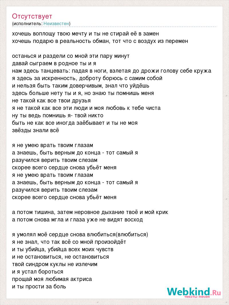хочешь воплощу твою мечту и ты не стирай её в замен хочешь подарю в реальность обман, тот что с воздух из перемен останься и раздели со мной эти пару минут давай сыграем в родное ты и я нам здесь танцевать: падая в ноги, взлетая до дрожи голову себе кружа я здесь за искренность, доброту борюсь с самим собой и нельзя быть таким доверчивым, знал что уйдёшь здесь больше нету ты и я, но знаю ты помнишь меня не такой как все твои друзья я не такой как все эти люди и моя любовь к тебе чиста ну ты ведь помнишь я- твой никто быть не как все иногда заёбывает и ты не моя звёзды знали всё я не умею врать твоим глазам а знаешь, быть верным до конца - тот самый я разучился верить твоим слезам скорее всего сердце снова убьёт меня я не умею врать твоим глазам а знаешь, быть верным до конца - тот самый я разучился верить твоим слезам скорее всего сердце снова убьёт меня а потом тишина, затем неровное дыхание твоё и мой крик а потом снова мгла и глаза уже не видят восход я умолял моё сердце снова влюбиться(влюбиться) я не знал, что так всё со мной произойдёт и ты убийца, убийца всех моих чувств и не остановиться, не остановиться твой синдром куклы не излечим и я устал бороться прощай моя любимая актриса и ты прости за боль