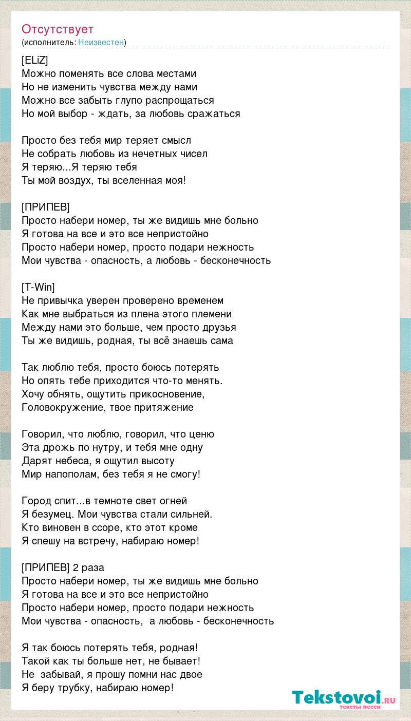 [ELiZ] Можно поменять все слова местами Но не изменить чувства между нами Можно все забыть глупо распрощаться Но мой выбор - ждать, за любовь сражаться Просто без тебя мир теряет смысл Не собрать любовь из нечетных чисел Я теряю...Я теряю тебя Ты мой воздух, ты вселенная моя! [ПРИПЕВ] Просто набери номер, ты же видишь мне больно Я готова на все и это все непристойно Просто набери номер, просто подари нежность Мои чувства - опасность, а любовь - бесконечность [T-Win] Не привычка уверен проверено временем Как мне выбраться из плена этого племени Между нами это больше, чем просто друзья Ты же видишь, родная, ты всё знаешь сама Так люблю тебя, просто боюсь потерять Но опять тебе приходится что-то менять. Хочу обнять, ощутить прикосновение, Головокружение, твое притяжение Говорил, что люблю, говорил, что ценю Эта дрожь по нутру, и тебя мне одну Дарят небеса, я ощутил высоту Мир напополам, без тебя я не смогу! Город спит...в темноте свет огней Я безумец. Мои чувства стали сильней. Кто виновен в ссоре, кто этот кроме Я спешу на встречу, набираю номер! [ПРИПЕВ] 2 раза Просто набери номер, ты же видишь мне больно Я готова на все и это все непристойно Просто набери номер, просто подари нежность Мои чувства - опасность, а любовь - бесконечность Я так боюсь потерять тебя, родная! Такой как ты больше нет, не бывает! Не забывай, я прошу помни нас двое Я беру трубку, набираю номер!