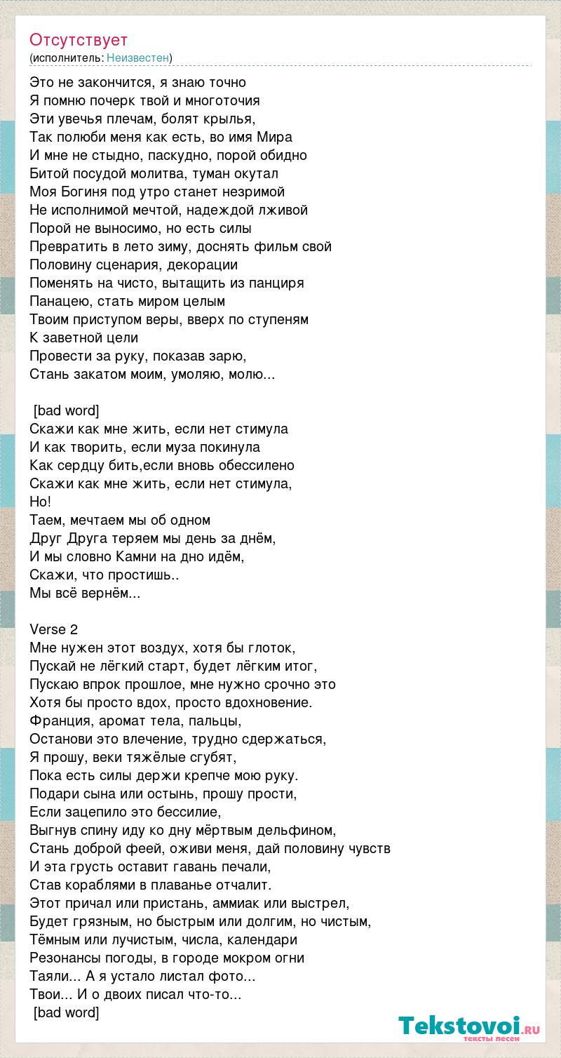 Это не закончится, я знаю точно Я помню почерк твой и многоточия Эти увечья плечам, болят крылья, Так полюби меня как есть, во имя Мира И мне не стыдно, паскудно, порой обидно Битой посудой молитва, туман окутал Моя Богиня под утро станет незримой Не исполнимой мечтой, надеждой лживой Порой не выносимо, но есть силы Превратить в лето зиму, доснять фильм свой Половину сценария, декорации Поменять на чисто, вытащить из панциря Панацею, стать миром целым Твоим приступом веры, вверх по ступеням К заветной цели Провести за руку, показав зарю, Стань закатом моим, умоляю, молю... [bad word] Скажи как мне жить, если нет стимула И как творить, если муза покинула Как сердцу бить,если вновь обессилено Скажи как мне жить, если нет стимула, Но! Таем, мечтаем мы об одном Друг Друга теряем мы день за днём, И мы словно Камни на дно идём, Скажи, что простишь.. Мы всё вернём... Verse 2 Мне нужен этот воздух, хотя бы глоток, Пускай не лёгкий старт, будет лёгким итог, Пускаю впрок прошлое, мне нужно срочно это Хотя бы просто вдох, просто вдохновение. Франция, аромат тела, пальцы, Останови это влечение, трудно сдержаться, Я прошу, веки тяжёлые сгубят, Пока есть силы держи крепче мою руку. Подари сына или остынь, прошу прости, Если зацепило это бессилие, Выгнув спину иду ко дну мёртвым дельфином, Стань доброй феей, оживи меня, дай половину чувств И эта грусть оставит гавань печали, Став кораблями в плаванье отчалит. Этот причал или пристань, аммиак или выстрел, Будет грязным, но быстрым или долгим, но чистым, Тёмным или лучистым, числа, календари Резонансы погоды, в городе мокром огни Таяли... А я устало листал фото... Твои... И о двоих писал что-то... [bad word]
