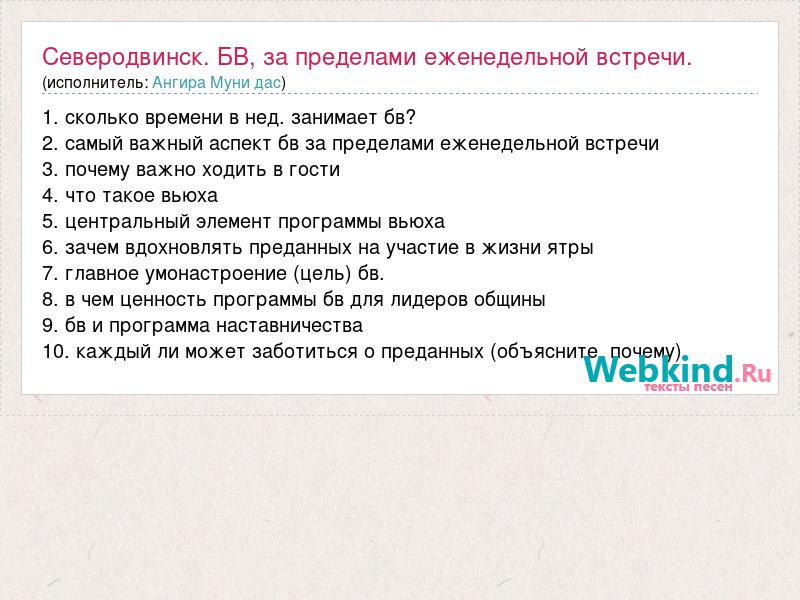 1. сколько времени в нед. занимает бв? 2. самый важный аспект бв за пределами еженедельной встречи 3. почему важно ходить в гости 4. что такое вьюха 5. центральный элемент программы вьюха 6. зачем вдохновлять преданных на участие в жизни ятры 7. главное умонастроение (цель) бв. 8. в чем ценность программы бв для лидеров общины 9. бв и программа наставничества 10. каждый ли может заботиться о преданных (объясните, почему)
