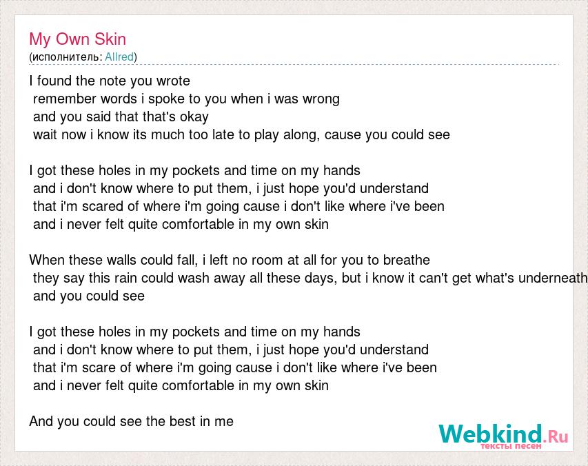 I found the note you wrote remember words i spoke to you when i was wrong and you said that that's okay wait now i know its much too late to play along, cause you could see I got these holes in my pockets and time on my hands and i don't know where to put them, i just hope you'd understand that i'm scared of where i'm going cause i don't like where i've been and i never felt [bad word] in my own skin When these walls could fall, i left no room at all for you to breathe they say this rain could wash away all these days, but i know it can't get what's underneath and you could see I got these holes in my pockets and time on my hands and i don't know where to put them, i just hope you'd understand that i'm scare of where i'm going cause i don't like where i've been and i never felt [bad word] in my own skin And you could see the best in me