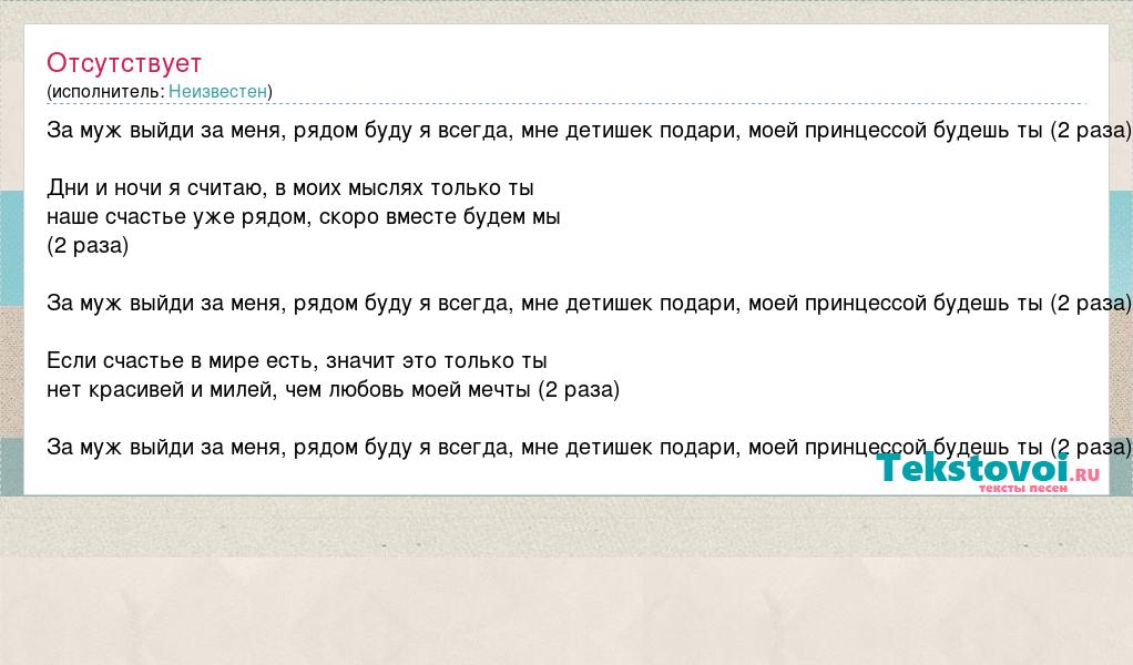 За муж выйди за меня, рядом буду я всегда, мне детишек подари, моей принцессой будешь ты (2 раза) Дни и ночи я считаю, в моих мыслях только ты наше счастье уже рядом, скоро вместе будем мы (2 раза) За муж выйди за меня, рядом буду я всегда, мне детишек подари, моей принцессой будешь ты (2 раза) Если счастье в мире есть, значит это только ты нет красивей и милей, чем любовь моей мечты (2 раза) За муж выйди за меня, рядом буду я всегда, мне детишек подари, моей принцессой будешь ты (2 раза)