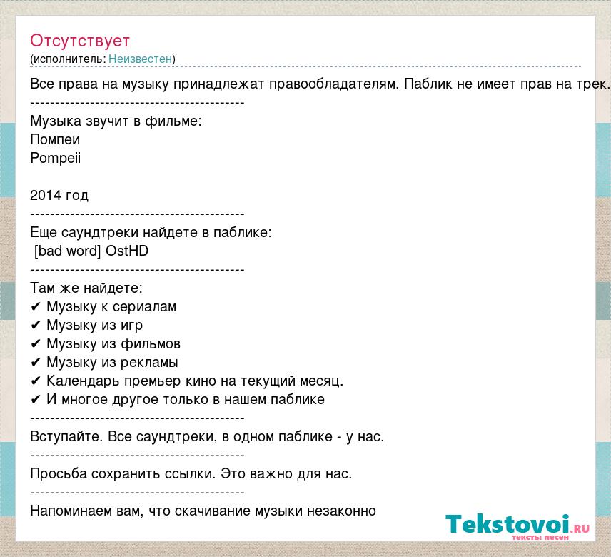 Все права на музыку принадлежат правообладателям. Паблик не имеет прав на трек. ------------------------------------------- Музыка звучит в фильме: Помпеи Pompeii 2014 год ------------------------------------------- Еще саундтреки найдете в паблике: [bad word] OstHD ------------------------------------------- Там же найдете: ✔ Музыку к сериалам ✔ Музыку из игр ✔ Музыку из фильмов ✔ Музыку из рекламы ✔ Календарь премьер кино на текущий месяц. ✔ И многое другое только в нашем паблике ------------------------------------------- Вступайте. Все саундтреки, в одном паблике - у нас. ------------------------------------------- Просьба сохранить ссылки. Это важно для нас. ------------------------------------------- Напоминаем вам, что скачивание музыки незаконно