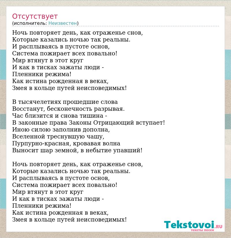 Ночь повторяет день, как отраженье снов, Которые казались ночью так реальны. И расплываясь в пустоте основ, Система пожирает всех повально! Мир втянут в этот круг И как в тисках зажаты люди - Пленники режима! Как истина рожденная в веках, Змея в кольце путей неисповедимых! В тысячелетиях прошедшие слова Восстанут, бесконечность разрывая. Час близится и снова тишина - В законные права Законы Отрицающий вступает! Иною силою заполнив дополна, Вселенной треснувшую чашу, Пурпурно-красная, кровавая волна Выносит шар земной, в небытие упавший! Ночь повторяет день, как отраженье снов, Которые казались ночью так реальны. И расплываясь в пустоте основ, Система пожирает всех повально! Мир втянут в этот круг И как в тисках зажаты люди - Пленники режима! Как истина рожденная в веках, Змея в кольце путей неисповедимых!